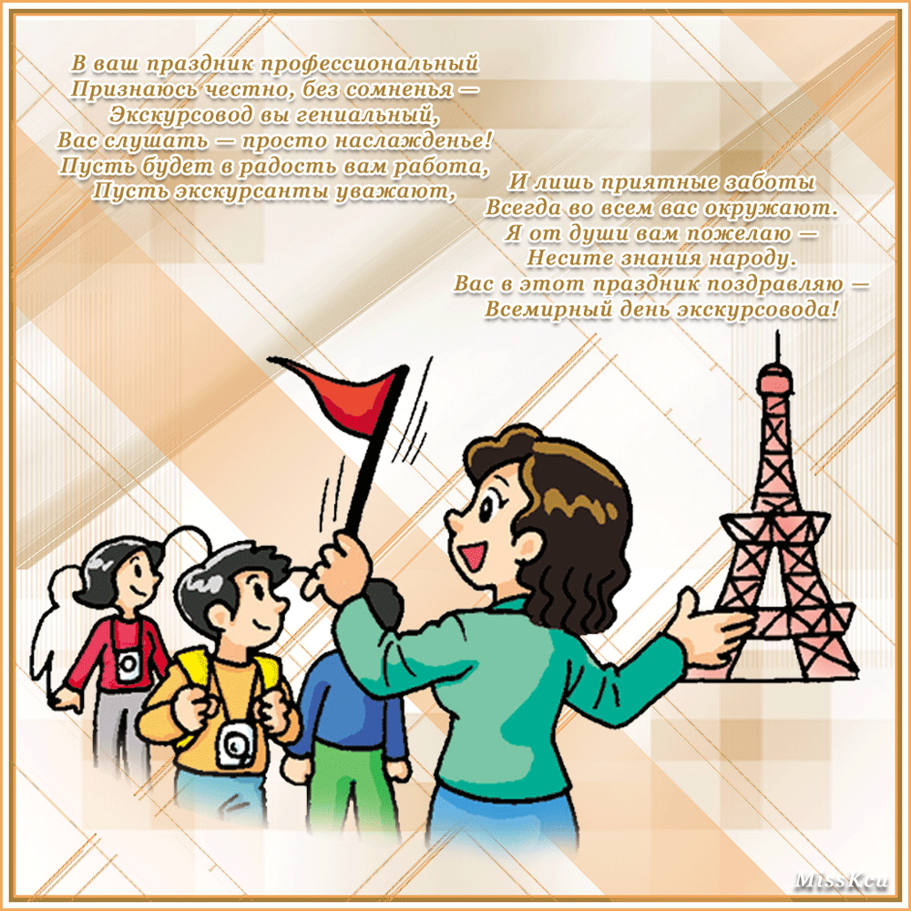 21 февраля 2024 года отмечается Всемирный день экскурсовода - это профессиональный праздник всех тех, кто занимается организацией и проведением экскурсий. В этот день стоит поздравить всех знакомых экскурсоводов, и для этого идеально подойдут красивые картинки, прикольные открытки, анимированные гифки и мерцающие изображения. Все эти картинки можно бесплатно скачать и отправить своим близким, друзьям и знакомым в социальных сетях или мессенджерах. Таким образом, Вы можете поделиться своим поздравлением и теплыми пожеланиями со Всемирным днем экскурсовода.